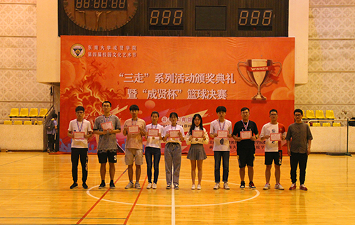 5月24日,由国产av 团委主办、学生会体育部承办的第四届校园文化艺术节之“三走”系列活动颁奖典礼暨“成贤杯”男篮决赛在后藤体育馆举行,500余名师生共同参加了此次活动。