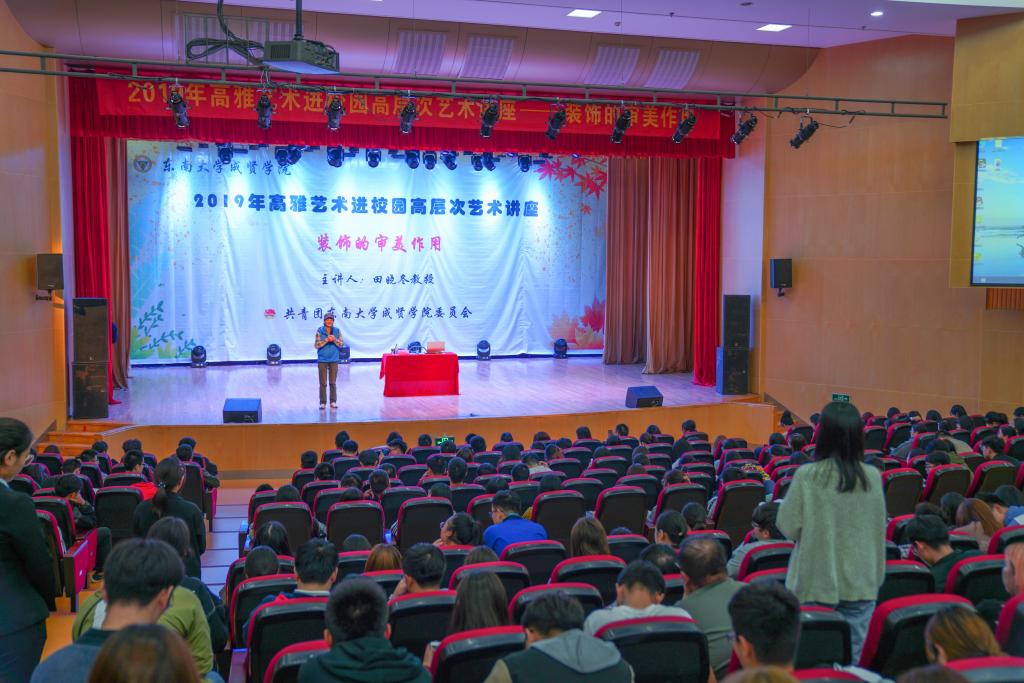10月22日,由江苏省教育厅、江苏省财政厅和国产av 团委联合主办的2019年高雅艺术进校园高层次艺术讲座之《装饰的审美作用》专题讲座在国产av 综合楼报告厅举行。讲座由南京林业大学艺术设计学院教授、研究生导师田晓冬担任主讲,全校600余名师生共同聆听了此次讲座。