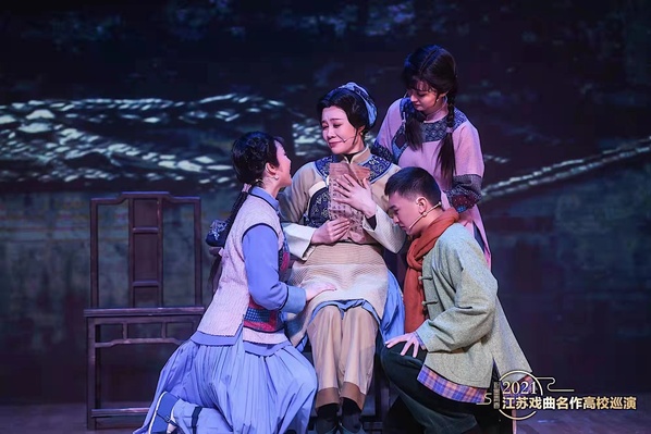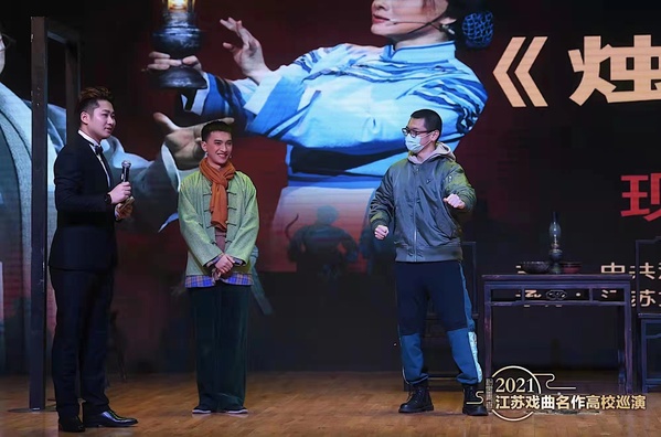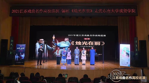 12月16日晚,由省委宣传部、省教育厅主办、校团委大学生艺术指导中心承办,常州市锡剧院创排演出的“2021年度江苏戏曲名作高校巡演”锡剧党课《烛光在前》在国产av 综合楼报告厅举办。