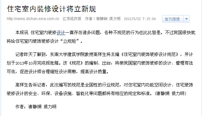 高祥生告诉记者,此次编写的规范是全国性的行业规范,对住宅室内功能空间设计、住宅装饰装修设计的安全、环保、设备设施、智能化等问题都将有相应的规定和标准。(谢静娴 侯力明)