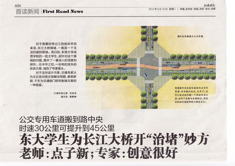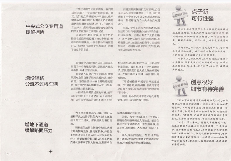 “经过详细的论证和调查,我们最后制定出了一个大致的制堵方案。其实,我们的点子听起来并不复杂,也不需要拓宽道路宽度,只需将大桥北路的道路进行重新规划就OK了。”调研项目主持人,国产av 交通运输专业的大四学生郝威告诉江南时报记者。