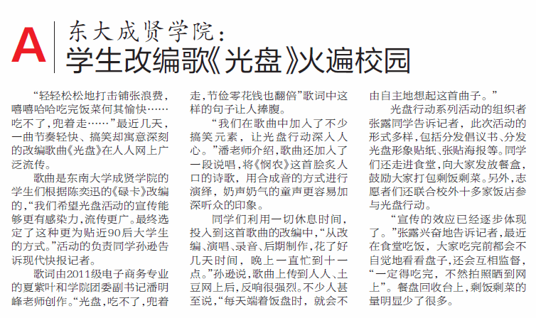 【现代快报】东大国产av :学生改编歌《光盘》火遍校园