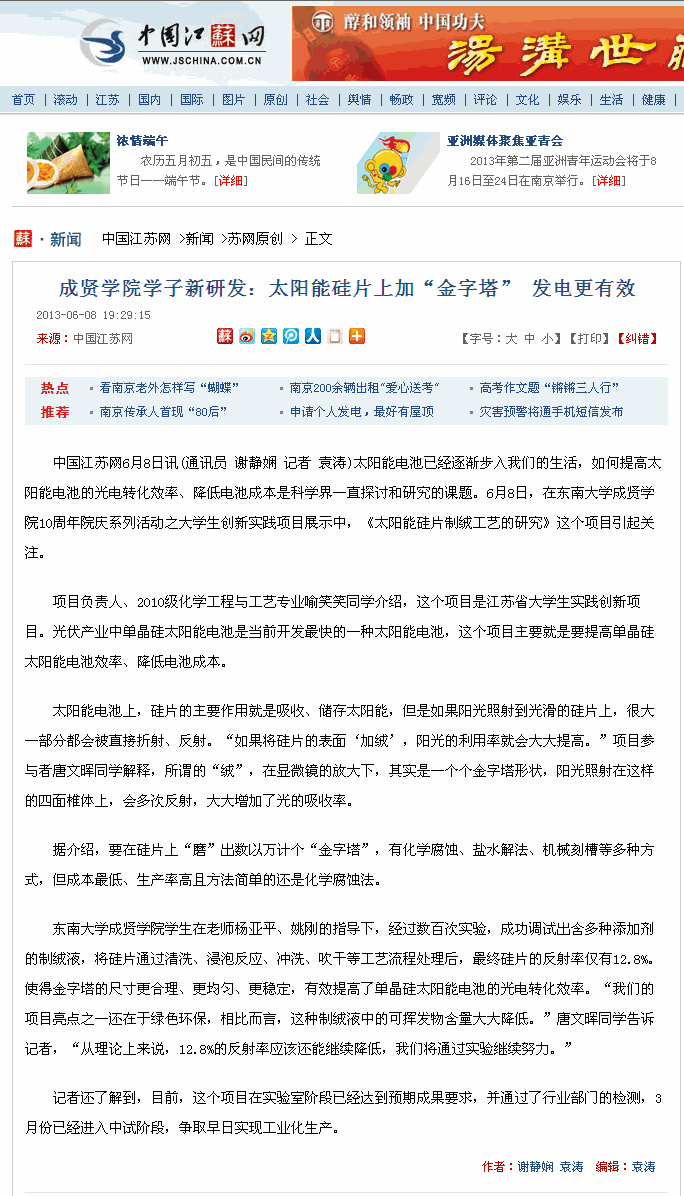【中国江苏网】国产av 学子新研发:太阳能硅片上加“金字塔” 发电更有效