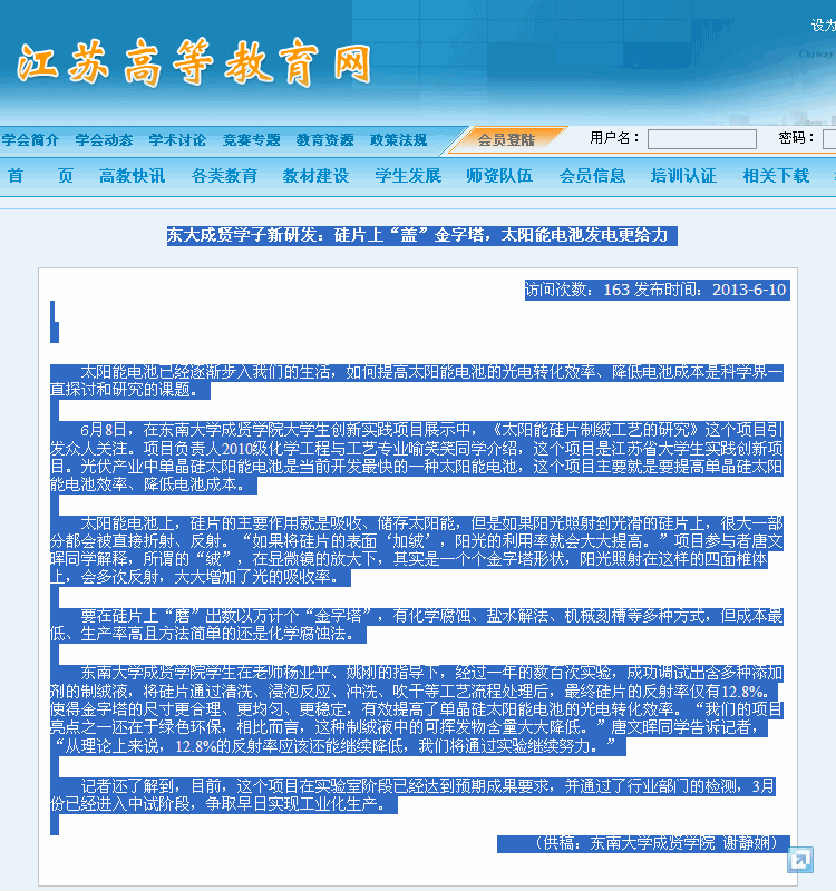 【江苏高等教育网】东大成贤学子新研发:硅片上“盖”金字塔,太阳能电池发电更给力