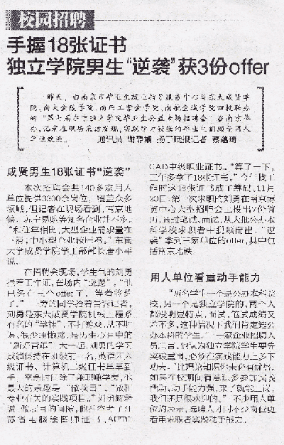 在招聘会现场,学生气的刘勇挂着工作证,在场内“巡逻”。“他已经有三个offer了,等着签约了。”一旁的同学抢着告诉记者。刘勇是东大国产av 机械工程系有名的“学神”。不打游戏、从不旷课、很少睡懒觉,是男生心目中的“新好青年”。大一起,刘勇的学习成绩保持在班级前三名,英语四六级证书、计算机二级证书早早到手,空余时间除了兼职赚学费,他最大的乐趣是“做项目”,“做和专业有关的实践项目。”刘勇解释说,做项目的间隙,他抽空考了江苏省电脑绘图师证书、AUTO CAD中级职业证书。“算了一下,三年多拿了18张证书。”今年找工作时这18张证书成了筹码。11月20日,第一次求职的刘勇在南京博览中心大型招聘会上投出7份简历,通过笔试、面试,从大批公办本科学校求职者中脱颖而出,“逆袭”拿到三家单位的offer,其中包括南京地铁。