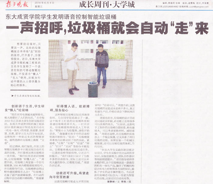 【扬子晚报】东大国产av 学生发明语音控制智能垃圾桶