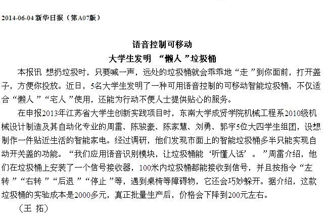 【新华日报】大学生发明“懒人”垃圾桶