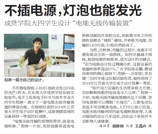 【南京晨报】不插电源,灯泡也能发光