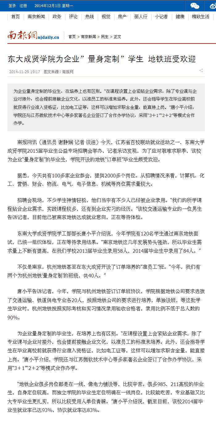 【南京日报】东大国产av 为企业”量身定制”学生 地铁班受欢迎