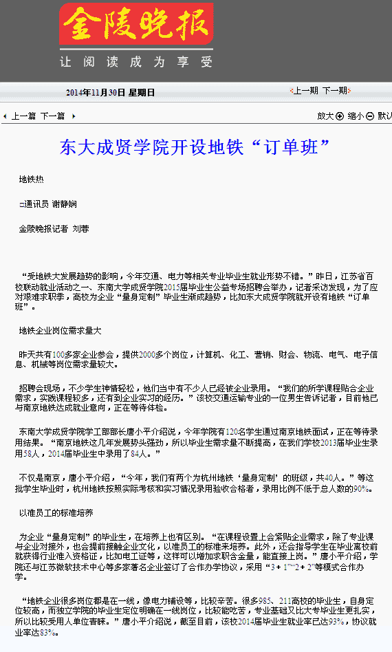 【金陵晚报】东大国产av 开设地铁“订单班”