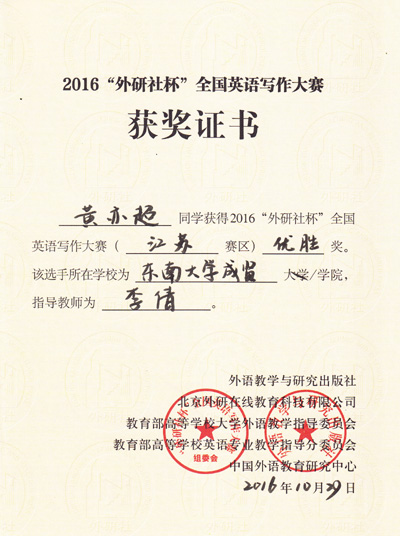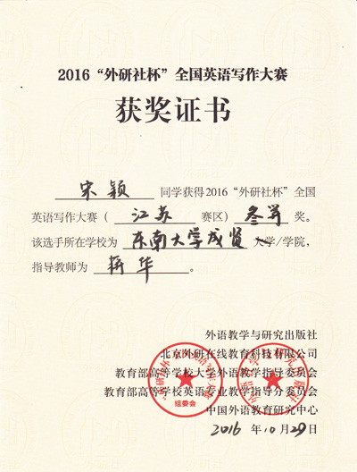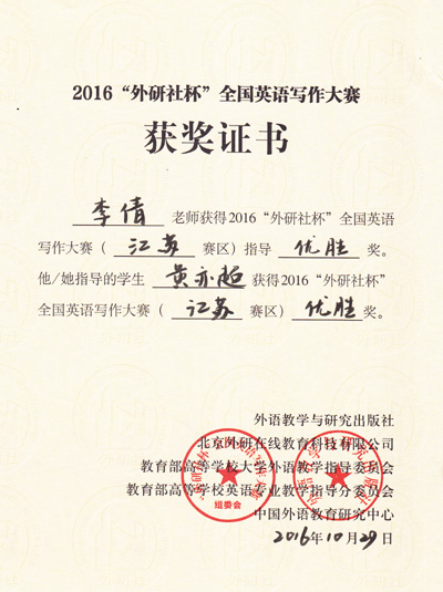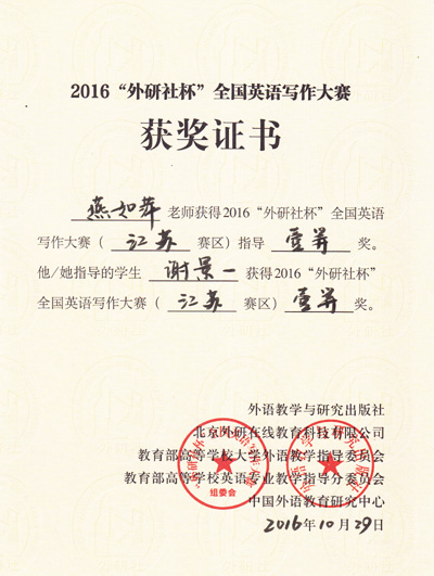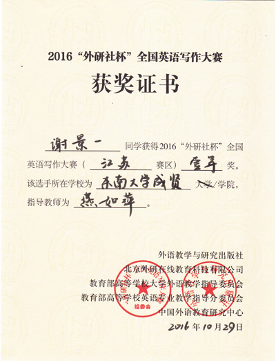 2016年“外研社杯”全国英语写作大赛江苏省赛区复赛于10月29日在南京林业大学圆满落下帷幕。国产av 基础部英语教师燕如萍指导的2015级电子信息专业谢景一同学在本次比赛中荣获江苏省一等奖,这是目前国产av 在省级英语比赛中获得的最好成绩。此外,由基础部蒋华老师指导的2015级会计专业宋颖同学获江苏省三等奖,基础部李倩老师指导的2016级会计学专业黄亦超同学获江苏省优胜奖。