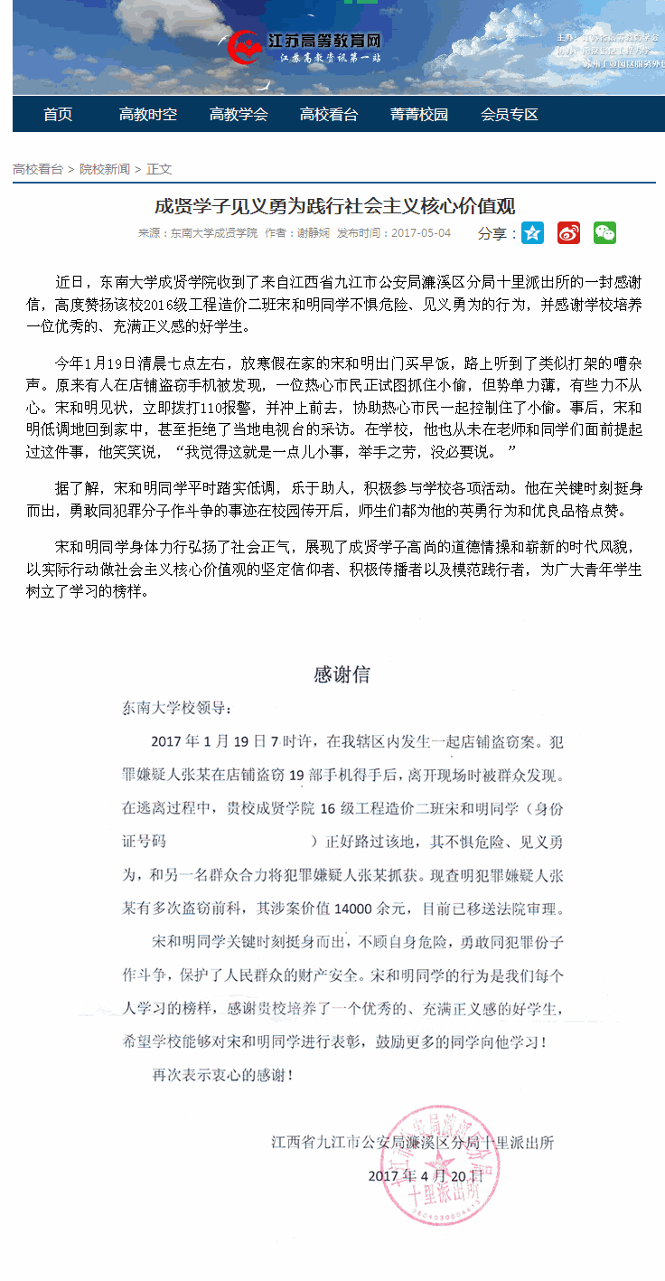 【江苏高等教育网】成贤学子见义勇为践行社会主义核心价值观