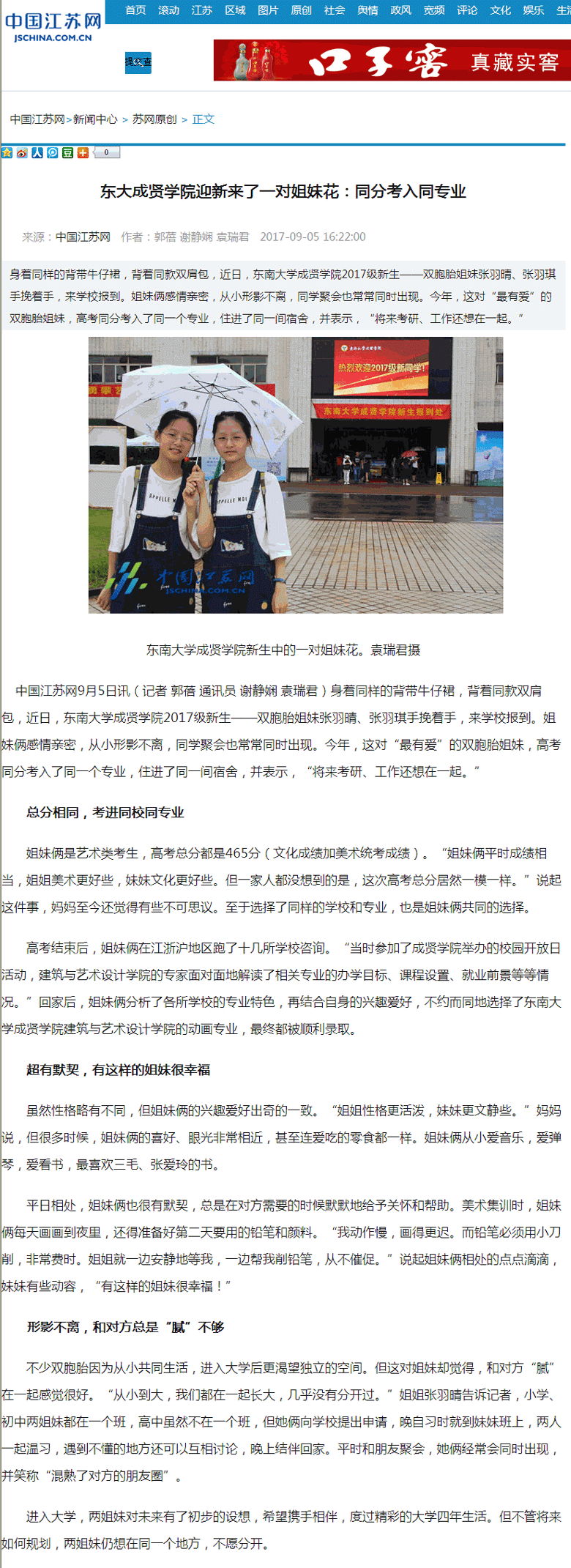 【中国江苏网】东大国产av 迎新来了一对姐妹花:同分考入同专业
