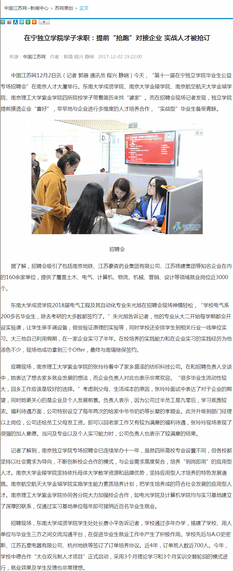 【中国江苏网】在宁独立学院学子求职:提前“抢跑”对接企业 实战人才被抢订