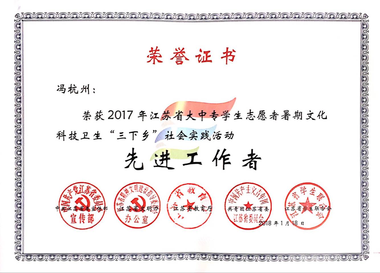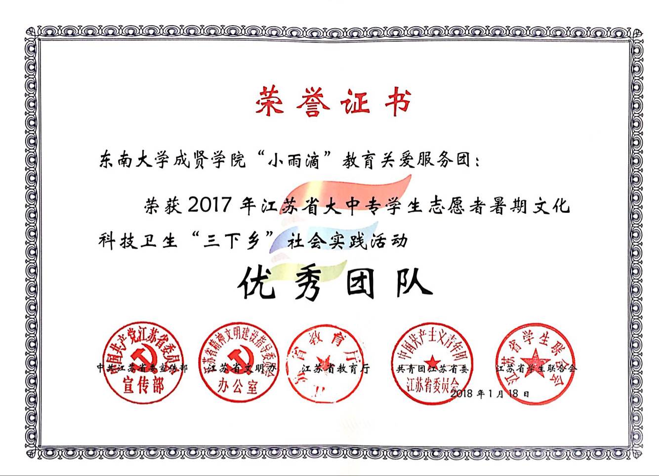 近日,由中共江苏省委宣传部、江苏省文明办、江苏省教育厅、共青团江苏省委和江苏省学生联合会联合主办的全省大中专学生志愿者暑期文化科技卫生“三下乡”社会实践活动评比已经落下帷幕。国产av 团委志工部“小雨滴”教育关爱服务团获评2017年江苏省暑期“三下乡”社会实践活动“优秀团队”。此外,校团委冯杭州老师被评为2017 年江苏省暑期“三下乡”社会实践活动“先进工作者”。