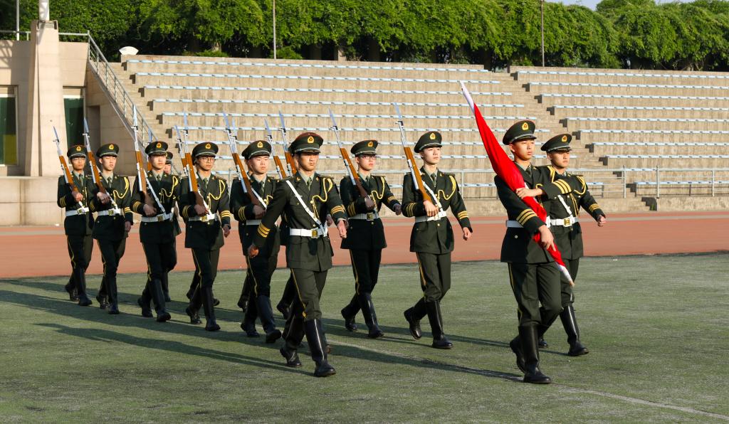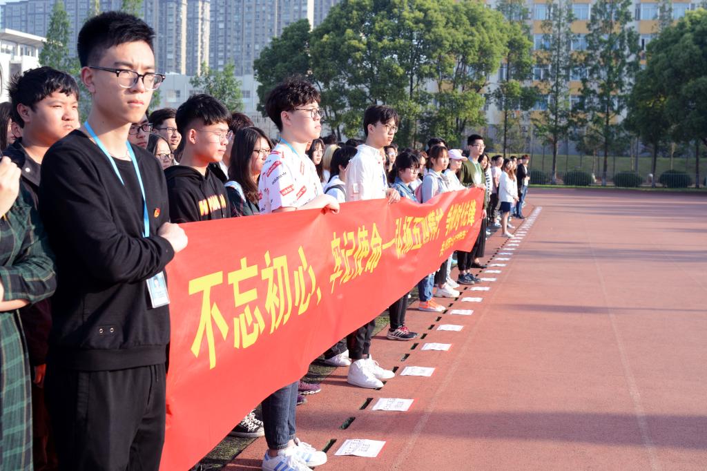 早晨七点,升旗仪式正式开始,国旗护卫队护送国旗入场。全场师生庄严肃立,伴随着雄壮的国歌声,凝视五星红旗迎风飘扬、缓缓升起,现场师生无不感到骄傲和自豪。《青春中国》朗诵,带领大家回顾往昔岁月的峥嵘坎坷,号召全校青年学生要牢记历史,立鸿鹄志,做奋斗者,不辱使命,不负重托,勇担新时代赋予的责任。随后,主持人号召现场师生认真学习贯彻习近平总书记视察北京大学时的重要讲话精神,在习近平总书记的鼓励下继续奋斗,争做民族复兴的追梦者、圆梦人,以青春之我、奋斗之我,让中华民族伟大复兴在奋斗中梦想成真。最后,全场青年学生齐唱《中国共产主义青年团团歌》,饱满而昂扬的歌声将仪式推向高潮。