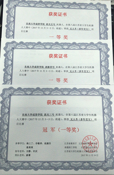 此次无人车交互项目共有60支队伍参赛,竞争激烈。国产av 电科、电信及自动化专业谷敏章、杨上丁、赵康杰、温易宸组成的流光三号获得冠军。电科、自动化及土木专业房楚尧、倪志成、杨啸尘、宋正文组成的流影四号和电科、自动化及计算机专业余凡、邱以强、姜小山、李洪鹏组成的流光五号在比赛中获得了第三名和第四名的好成绩,由于赛事规定一个学校只能在冠、亚、季军中占一席,所以后两支队伍排名顺延一位。