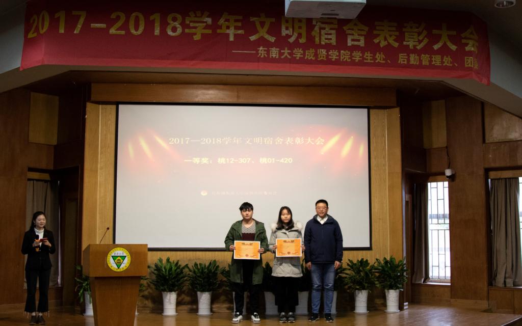 大会伊始,后勤管理处副处长丁秀山宣读了《关于2017-2018学年文明宿舍表彰的决定》;随后,团委书记潘明烽、后勤管理处副处长丁秀山、学生处处长助理颜秉明和后勤管理处赵萍萍四位老师分别为获得文明宿舍特、一、二、三等奖的宿舍颁奖。其中,桃11-404-2宿舍摘得特等奖;一等奖宿舍2个(桃12-307、桃1-420);二等奖宿舍4个(桃12-308、桃13-301、桃18-112、桃1-224);三等奖宿舍有6个(桃3-114、桃17-216、桃18-505、桃16-404、桃17-622、桃3-524)。在对宿管部经理谢春蓉和文明宿舍代表访谈时,谢经理分享了宿舍管理工作的经验,强调了文明宿舍建设的重要性;文明宿舍代表分享了舍友关系相处的小秘诀,讲述了舍友之间互相帮扶的温馨故事。最后,后勤管理处副处长丁秀山老师作了总结讲话。丁老师对受到表彰的先进集体表示祝贺,同时也希望同学们能以宿舍为思想阵地,提高文明素质,加强凝聚力建设,积极构建文明的宿舍文化,共同营造一个温馨、和谐的宿舍氛围。