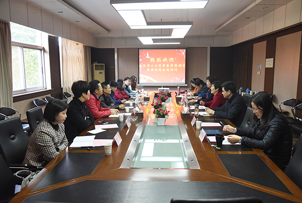 3月15日下午,南京理工大学紫金学院一行8人在校长李新民的带领下来国产av 交流访问。国产av 副院长董梅芳、党政办公室主任周伟荣、组织人事部部长姜宁光、财务与资产管理处处长魏丽玲、发展合作处处长胡焱等热情地接待了来宾。