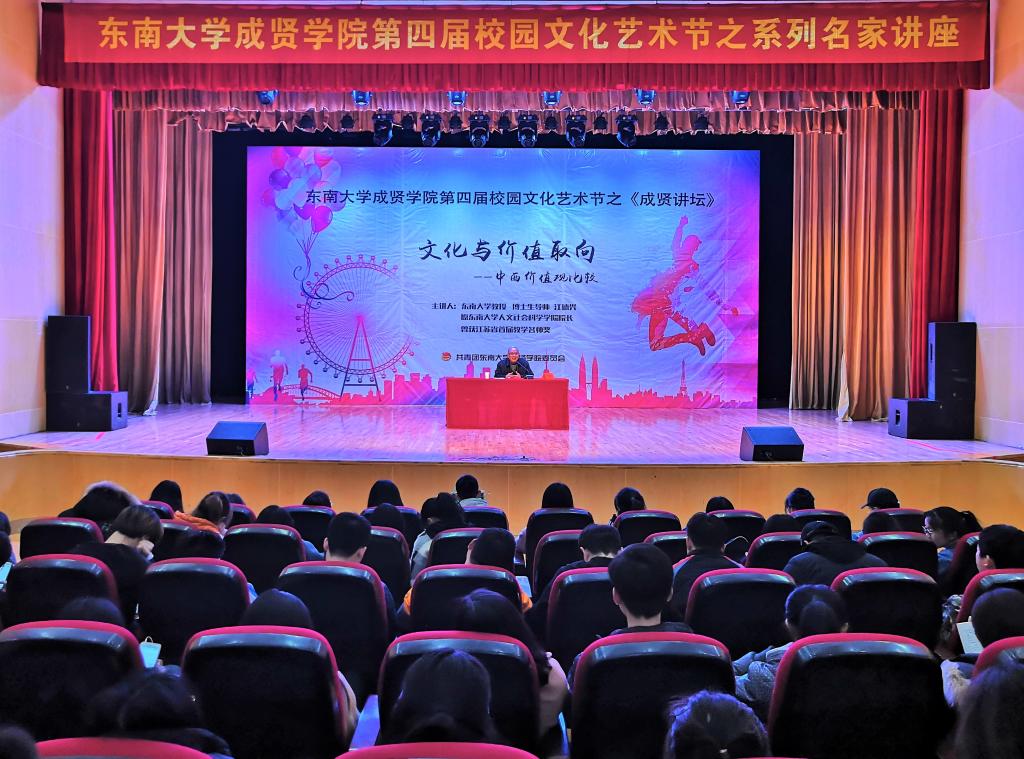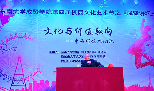 3月22日,由校团委主办的“文化与价值取向——中西文化价值观比较”专题报告会在综合楼报告厅举行。国产av 博士生导师、原人文社会科学学院院长江德兴教授担任主讲,我院600余名师生共同聆听了此次报告。