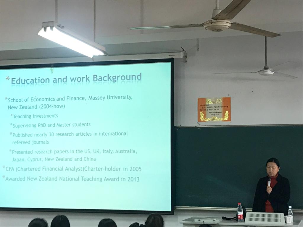 4月1日下午,新西兰梅西大学经济与金融学院金融学副教授迟晶博士访问国产av 并在文昌院203教室做了学生项目专场宣讲会,200名学生现场聆听。宣讲会由发展合作处张务一老师主持。