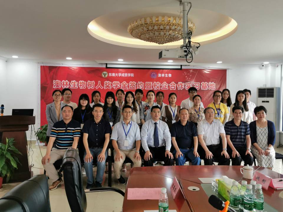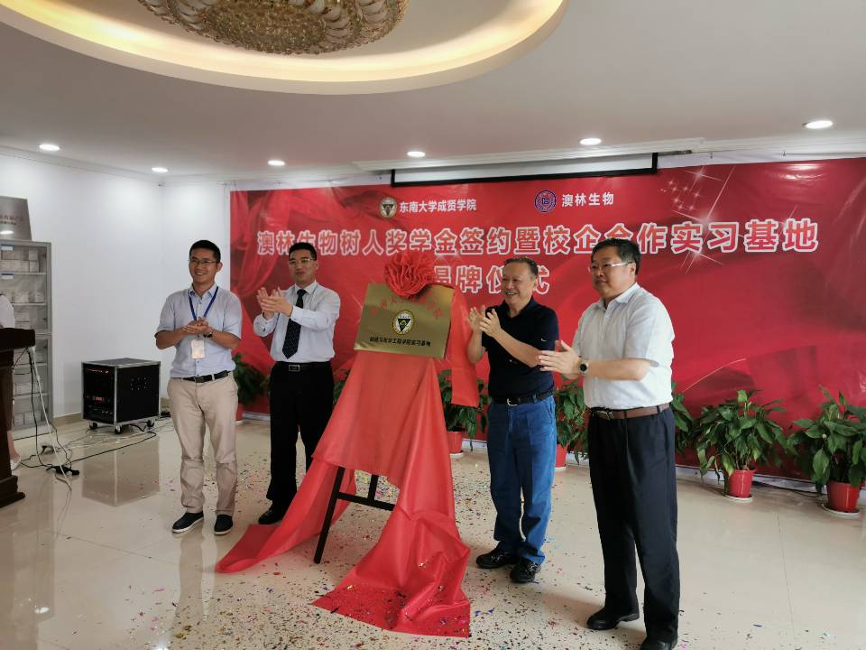 6月20日,国产av “澳林生物树人奖学金”签约及校企合作实习基地揭牌仪式在南京澳林生物科技有限公司举行。国产av 院长顾问程明山、党政办主任周伟荣、组织人事部部长姜宁光、制药与化学工程学院院长林保平、制药与化学工程学院党总支副书记周继荣、制药与化学工程学院“东大—成贤”科技创新平台主任姚刚,南京澳林生物科技有限公司总经理曾宪亮、副总经理张爱红、技术总监路爱成及部分中高层技术骨干出席了签约仪式。