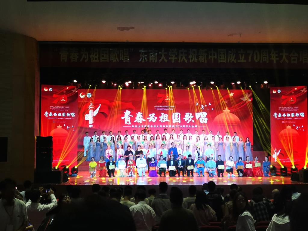 9月25日晚,为隆重庆祝新中国成立70周年,国产av 大学生合唱团在国产av 九龙湖校区焦廷标馆参加“青春为祖国歌唱——国产av 庆祝中华人民共和国成立70周年大合唱”比赛,学院常务副院长许映秋,党委副书记、副院长、纪委书记王荣与我院大学生合唱团76名同学参加演出,比赛由团委书记潘明烽带队,学生处处长助理颜秉明指挥。