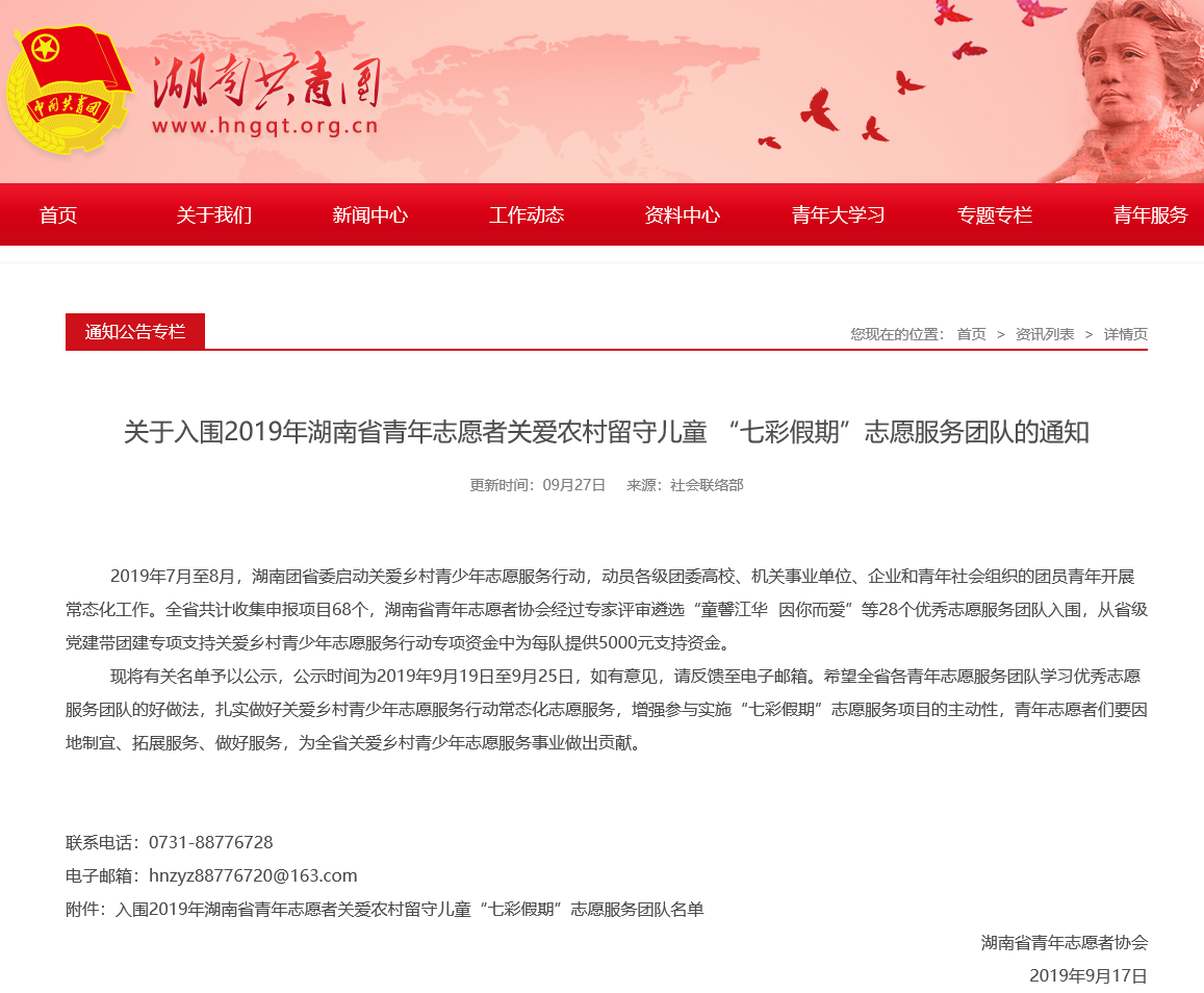 由电子与计算机工程学院2017级计算机科学与技术专业李帅同学担任领队的国产av 暑期社会实践团队皮皮支教小分队,在2019年湖南省青年志愿者关爱农村留守儿童“七彩假期”志愿服务项目中获评“优秀志愿服务团队”称号,并得到5000元支持资金。