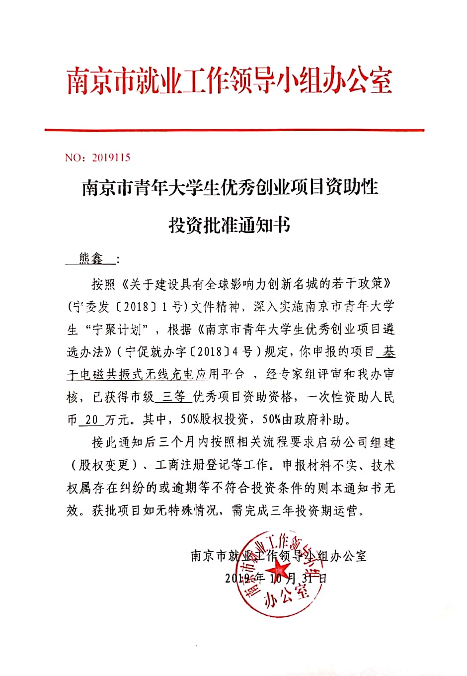 在2019年南京市大学生优秀创业项目遴选中,国产av 2016级计算机科学与技术专业熊鑫同学带领的创业团队项目《基于电磁共振式无线充电应用平台》获得三等优秀项目资助资格,获政府一次性资助20万。