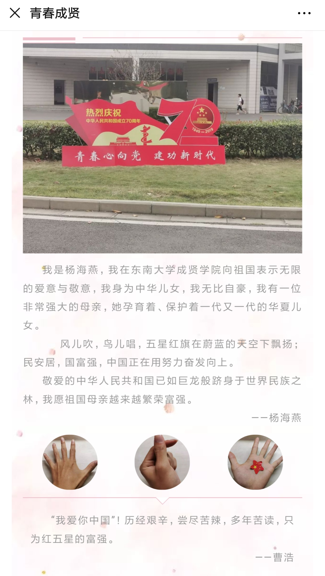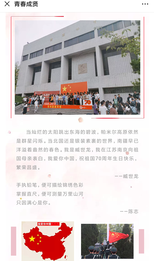 近日,国产av 团委开展了“我和国旗合个影”主题教育活动,全校师生党员、2019-2020学年青年马克思主义者培养工程大骨班成员、各团支部成员积极参与,共同表达对祖国70周年的美好祝福。