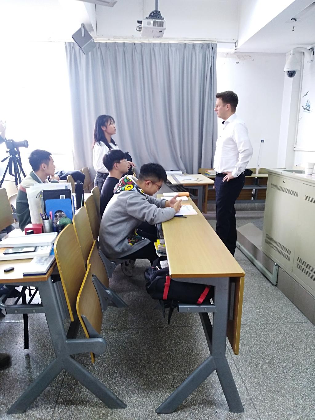 下午,费希尔先生与2018级双元制学生进行了亲切交流,鼓励学生认真学习,努力实践。随后,费希尔先生与2017级学生一起完成了“中德文化差异”课程考核,在分组汇报中,学生们进行了精心准备,采用了角色扮演、互动讨论等方式图文并茂的展示了中德文化差异,费希尔先生一一点评,与学生开展互动。