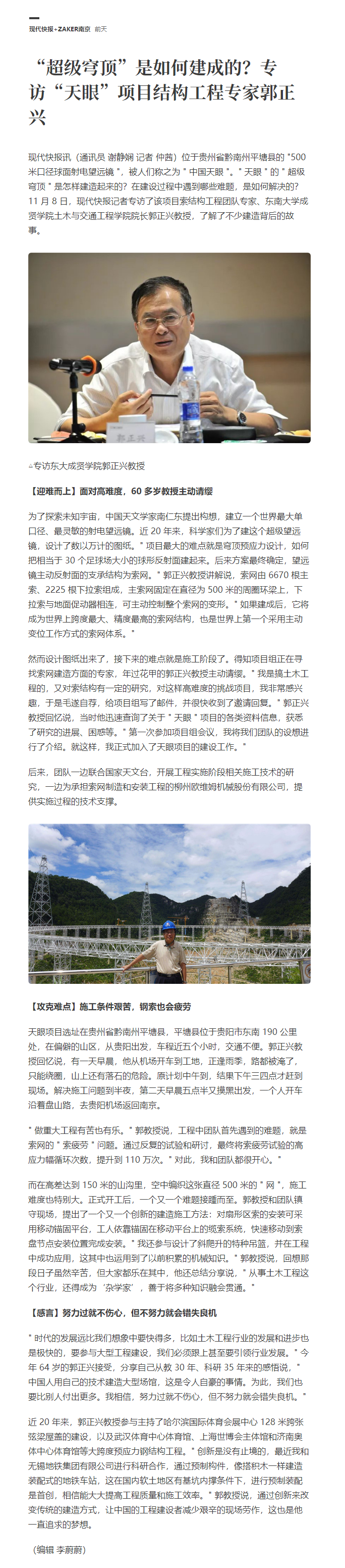 【现代快报】“超级穹顶”是如何建成的?专访“天眼”项目结构工程专家郭正兴