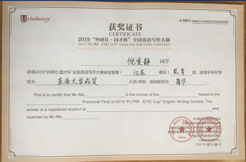 该挑战赛分为英语阅读大赛、英语写作大赛和英语演讲大赛三部分,在江苏赛区英语阅读大赛中,73所本科院校共223名选手参赛,国产av 2017级会计1班邓一纯(指导老师:周爱萍)荣获一等奖,在全省名列第十一;2017级建筑工程1班孟奕飞(指导老师:朱宇博)获得二等奖;2018级国贸2班蔡朵妍(指导老师:周爱萍)获得三等奖。