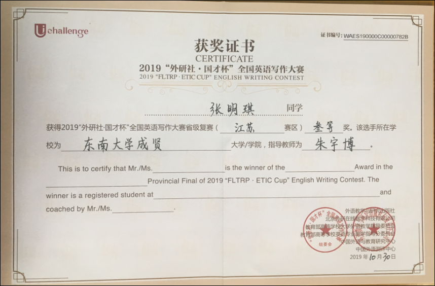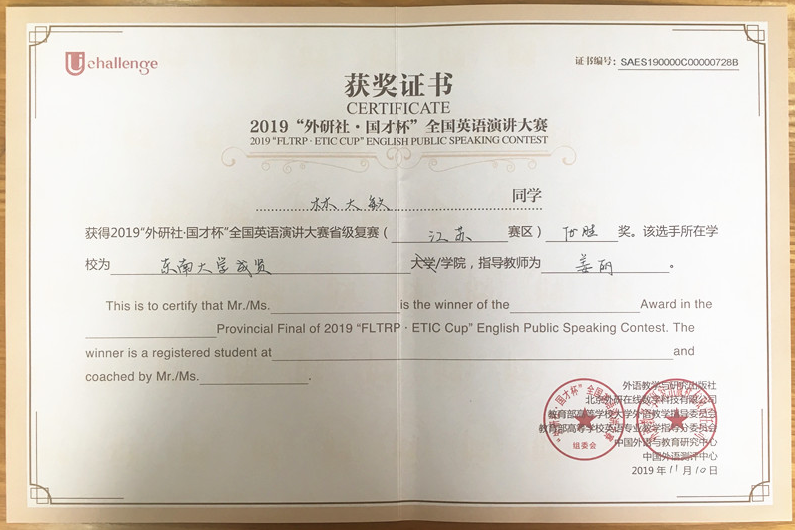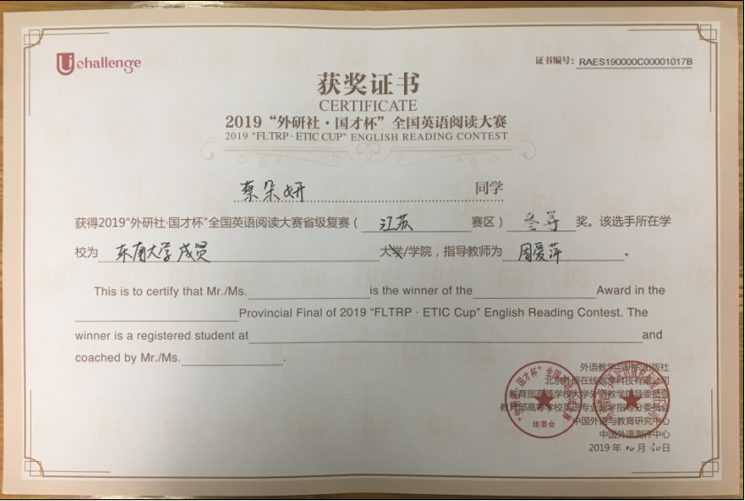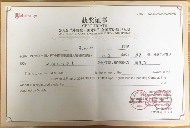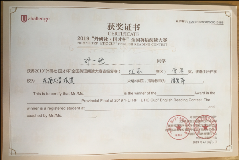 该挑战赛分为英语阅读大赛、英语写作大赛和英语演讲大赛三部分,在江苏赛区英语阅读大赛中,73所本科院校共223名选手参赛,国产av 2017级会计1班邓一纯(指导老师:周爱萍)荣获一等奖,在全省名列第十一;2017级建筑工程1班孟奕飞(指导老师:朱宇博)获得二等奖;2018级国贸2班蔡朵妍(指导老师:周爱萍)获得三等奖。