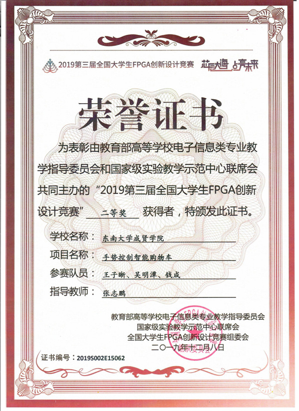 总决赛于12月6日至12月8日在南京江北新区ICisC人才实训基地举办。国产av 电子与计算机工程学院张志鹏老师指导的多个项目组进入全国总决赛,最终“我去深海捞板子”团队王子晰、吴明潭、钱成制作的《手势遥控智能购物机器人》获得“全国二等奖”,该项目同时获得上海安路信息科技有限公司“企业特别奖”。