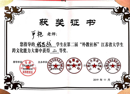 11月20日,第二届“外教社杯”江苏省大学生跨文化能力在扬州大学成功举行,来自江苏省各大本科及高职院校的在读学生,留学生及指导老师和评委共计约150人与会。国产av 首次组织学生参赛,经过激烈的角逐,2017级会计1班的程思越同学荣获二等奖,展示了良好的英语语言能力和跨文化交际能力。