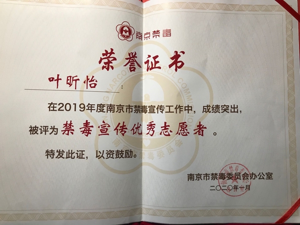 2020年1月5日,2019南京禁毒宣传工作总结会在南京师范大学仙林校区音乐厅召开。省禁毒办常务副主任、省公安厅禁毒总队总队长张波,市局党委委员、市禁毒委副主任曹存福,市禁毒办副主任、市公安局禁毒支队支队长仲军,市教育局宣传与德育工作处处长完进、市公安局禁毒支队副支队长刘庆峰、团市委副调研员陶涛以及各地区高校禁毒志愿者们参加了本次禁毒宣传工作总结表彰会。国产av 青年志愿者协会因2019年在禁毒宣传工作上表现突出,被评为“禁毒宣传优秀组织”,国产av 叶昕怡同学被评为“优秀志愿者”。