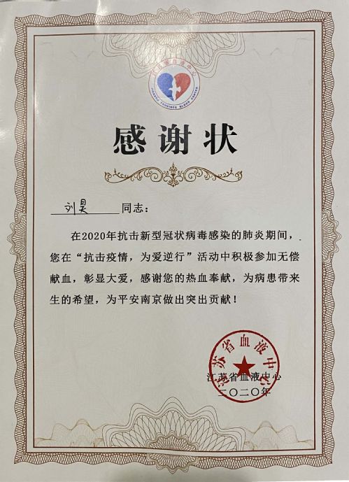 来自江苏省血液中心的感谢信