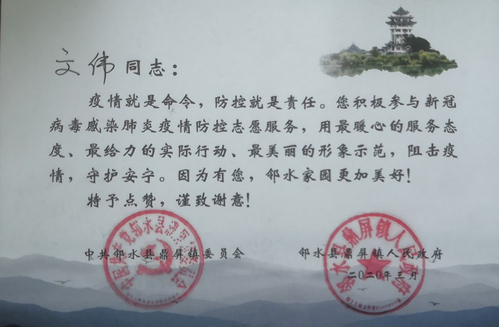 连云港市赣榆区沙河镇西胜村党总支在感谢信中写道:颜秉明老师春节返乡期间,主动请缨,扛起责任,报名参加党员志愿服务岗,在交通检查点登记检查过往车辆、劝返无关人员进村、协助开展疫情防控知识宣传教育工作等。同时,还向村里无偿捐赠了一批价值3000元的防疫物资。他的先进事迹被江苏省文明网、交汇点新闻等多家媒体宣传报道。