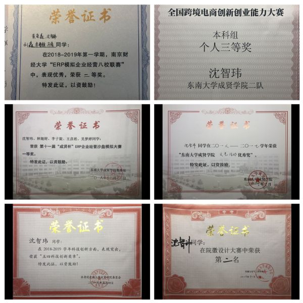 【个人简介】沈智玮,机械与电气工程学院2020届电气工程及其自动化专业毕业生,曾任机电学院学生会副主席、学生会宣传部部长、班级心理委员等职位。曾获校综合奖学金、文艺活动优秀奖、优秀工作奖,斩获CALE全国跨境电商创新创业能力大赛本科组个人三等奖、南京财经大学“ERP模拟企业经营八校联赛”二等奖、第十一届“成贤杯”ERP企业经营沙盘模拟大赛一等奖、校“互联网+”创新大赛一等奖、校数学建模三等奖等竞赛奖项。近期收到悉尼大学、新南威尔士大学、昆士兰大学的offer。