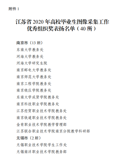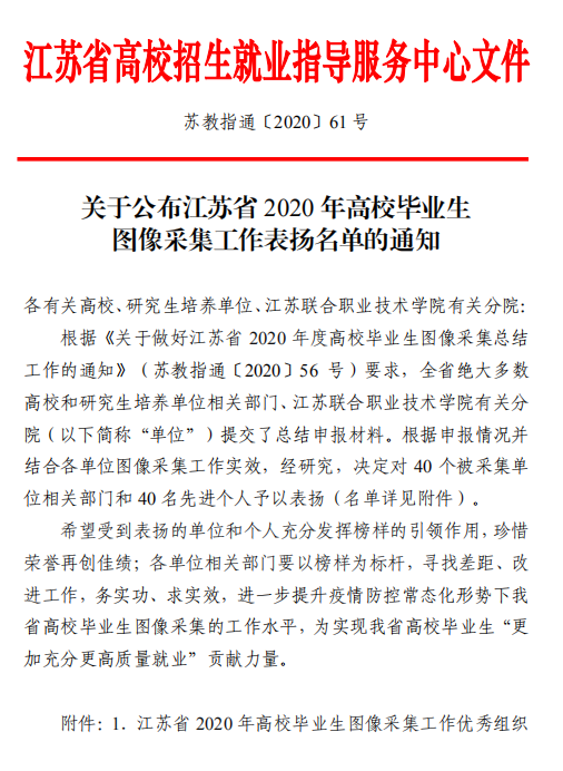 近日,江苏省高校招生就业指导服务中心公布了江苏省2020年高校毕业生图像信息采集工作表扬名单,国产av 教务处荣获“江苏省2020年高校毕业生图像采集工作优秀组织奖”。