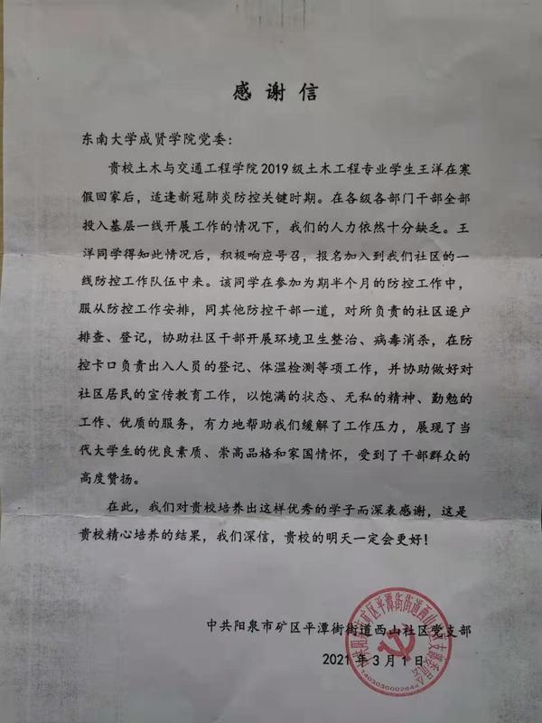 近日,国产av 党政办公室收到了来自中共阳泉市矿区平潭街道西山社区党支部发来的感谢信,信中提到国产av 土木与交通工程学院2019级土木工程2班王洋同学在寒假期间积极响应号召,报名加入社区的一线防控工作队伍,以实际行动彰显当代青年学子的责任与担当。