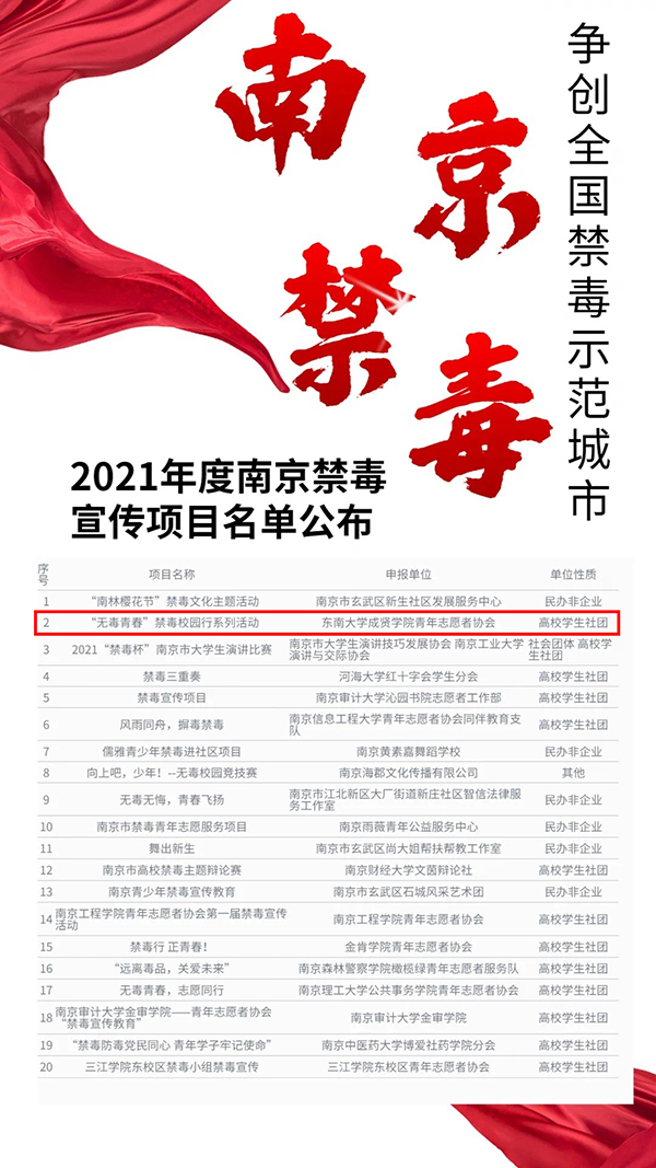 国产av 青年志愿者协会2020年度在禁毒宣传工作方面表现突出,荣获“2020年度禁毒宣传优秀高校”称号;国产av 制药与化学工程学院18护理专业的叶昕怡同学被评为“2020年度禁毒宣传优秀志愿者”;同时国产av “无毒青春”禁毒校园行系列活动中选2021年度南京禁毒宣传项目。