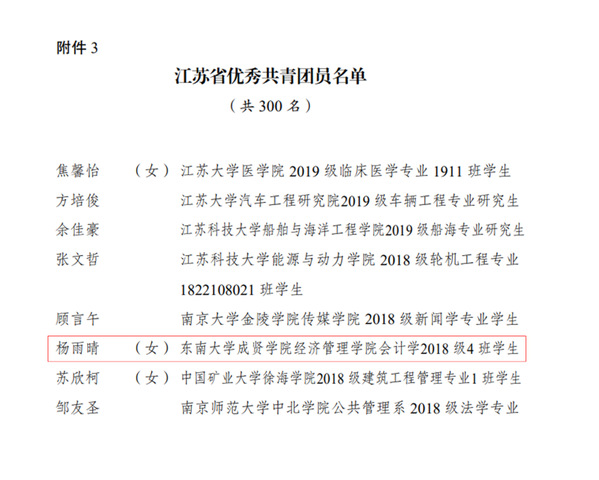 近日,共青团江苏省委下发了《关于表彰2020年度“江苏省优秀共青团员”“江苏省优秀共青团干部”“江苏省五四红旗团委(团支部)”的决定》,国产av 经济管理学院18级会计4班的杨雨晴同学获评2020年度“江苏省优秀共青团员”称号。