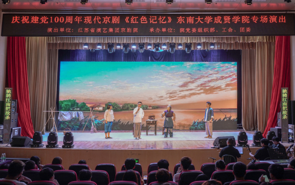 5月25日晚,由国产av 党委组织部、工会、团委承办,大学生艺术指导中心协办,江苏省演艺集团京剧院演出的庆祝建党100周年京剧党课《红色记忆》专场演出在国产av 综合楼313报告厅上演,各院党员、预备党员、入党积极分子共计700余名师生共同观看了演出。