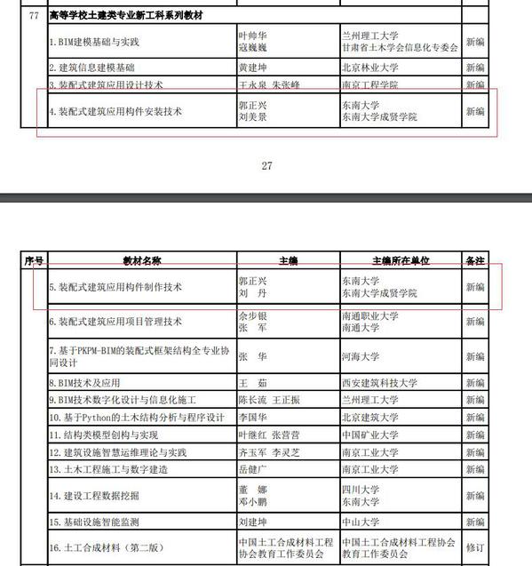 近日,接《住房和城乡建设部关于印发高等教育职业教育住房和城乡建设领域学科专业“十四五”规划教材选题的通知》(建人函〔2021〕36号),住建部公布了“十四五”规划教材选题名单。经过单位申报、专家评审,国产av 土木与交通工程学院郭正兴教授、刘美景副教授、刘丹副教授申请的《装配式建筑应用构件安装技术》《装配式建筑应用构件制作技术》2项教材获批。