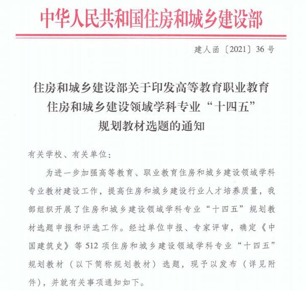 此次“十四五”规划教材选题申报和评选工作是住建部为了进一步加强高等教育、职业教育住房和城乡建设领域学科专业教材建设工作,提高住房和城乡建设行业人才培养质量,面向全国高等教育、高等职业教育、中等职业教育单位征集选题,吸引了来自清华大学、国产av 、浙江大学、同济大学等全国知名高校的住房和城乡建设领域学科专业的专家和学者申报,最终确定高等教育类、高等职业教育类、中等职业教育类共计512项选题,国产av 是全国高等教育类单位中唯一获得住建部“十四五”规划教材立项的民办高校。