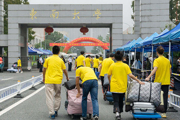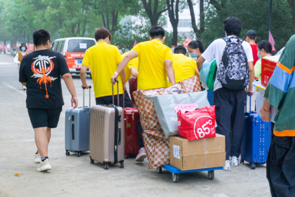 迎新当天,为做好疫情常态化防控工作,新生按照流程错峰进校。南京市公安局江北新区分局内保支队二大队刘维大队长一行、江北新区公安分局泰山新村派出所李庆伟副所长一行、江北新区公安分局交通警察支队第一大队高新中队刘梦辰中队长一行协助国产av 保卫工作,在校区及周边进行交通疏导、维持秩序;迎新工作人员与志愿者学生一早到岗,为新生提供热心周到的服务,利用货车、小推车搬运行李,高效快捷;各学院井然有序为新生办理各项入学手续,答疑解惑;志愿者在火车站、地铁站、校内及周边亲切为家长、学生指引道路、搬运行李;“绿色通道”工作人员给予答疑解惑,给新生以人文关怀。