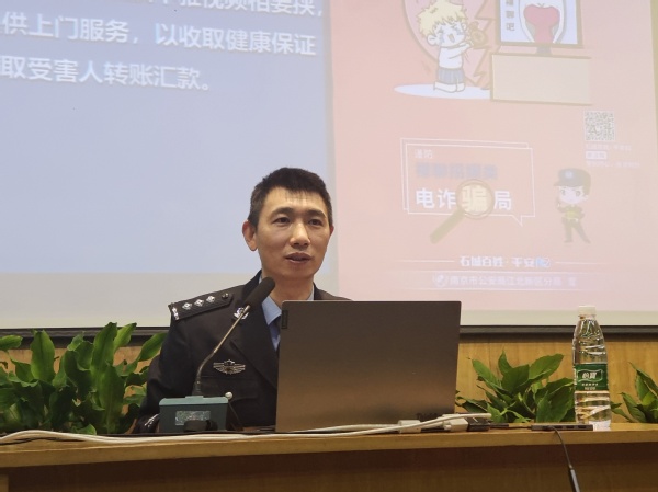 陆警官简要介绍了近期全市及江北新区高校、社会通讯网络诈骗发案情况,主要从背景定义及类型特征详细讲解了电诈案件团队的运行流程,深入剖析了电诈案件团队步步深入引导目标对象上当受骗的各种手段,最后提出了“未知链接不点击,陌生来电不轻信,个人信息不透露,转账汇款多核实”的防范建议。
