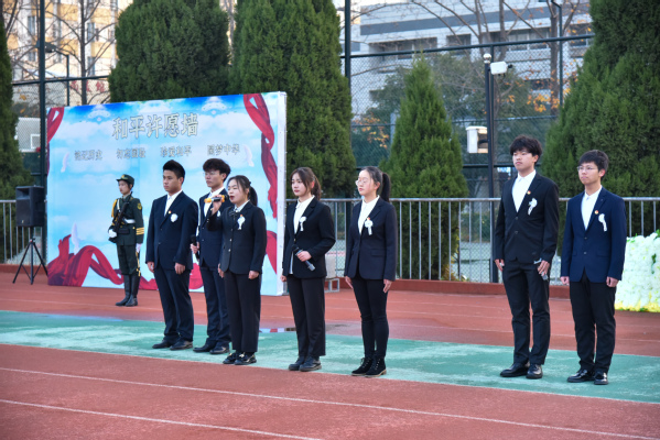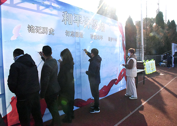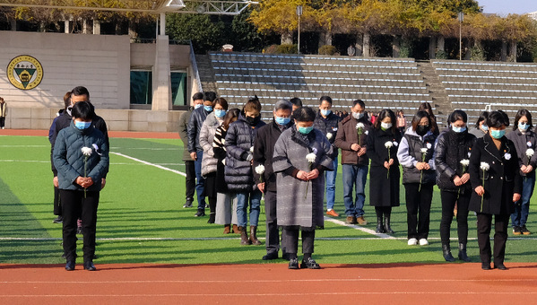 上午9:59分,国产av 常务副院长许映秋、院长顾问程明山、副院长戚易、副院长董梅芳、各职能部门负责人、机关各党支部成员聚集操场国旗台下,手捧白菊花一起参加祭奠悼念活动,学工党支部颜秉明主持仪式。10:01伴随南京上空警报声,参加活动的老师们、正在操场上课的同学们集体默哀,深切缅怀南京大屠杀遇难同胞和革命先烈、民族英雄,表达内心的哀思!随后,师生代表依次向南京大屠杀死难者国家公祭日纪念海报献上白菊,并在和平许愿墙上郑重写下自己的哀思寄语和对和平的美好祈愿。最后,全体师生在《和平宣言》的祈祷声中向世界发出了庄严的和平誓言,铿锵有力,声声入耳,誓把屠刀化警钟,牢记逝名刻史鉴。